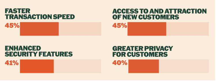 Winkels noemen meerdere voordelen van het accepteren van crypto. Zo noemt 45 procent snellere betalingen als belangrijk punt. Ook zegt 45 procent dat crypto helpt om nieuwe klanten aan te trekken. Verder ziet 41 procent betere beveiliging als voordeel, terwijl 40 procent wijst op meer privacy voor klanten.