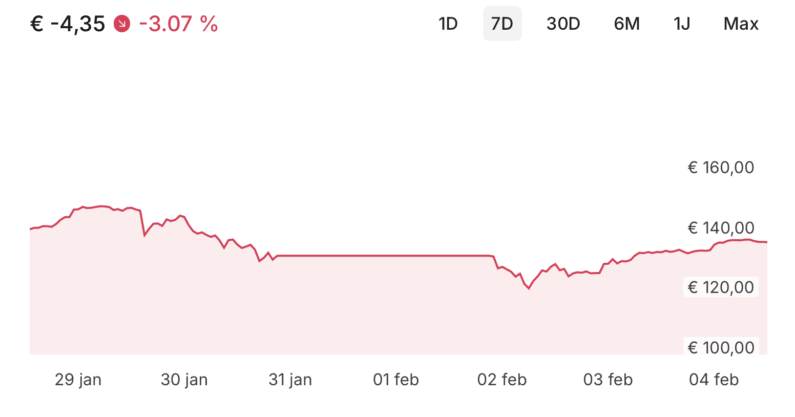 In de dagen die volgden daalde de koers echter met ruim 18 procent tot een dieptepunt van 121,99 euro op 2 februari. In de afgelopen paar dagen is de koers weer enigszins aan het herstellen.