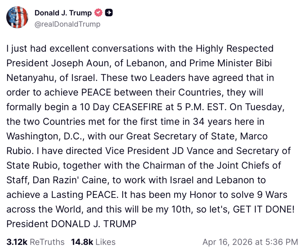Na onderhandelingen zijn Israël en Libanon overeengekomen een wapenstilstand in te lassen, kondigde de Amerikaanse president Donald Trump aan op socialmediaplatform Truth Social. De wapenstilstand start vanavond om 23:00 uur en zal tien dagen duren.
