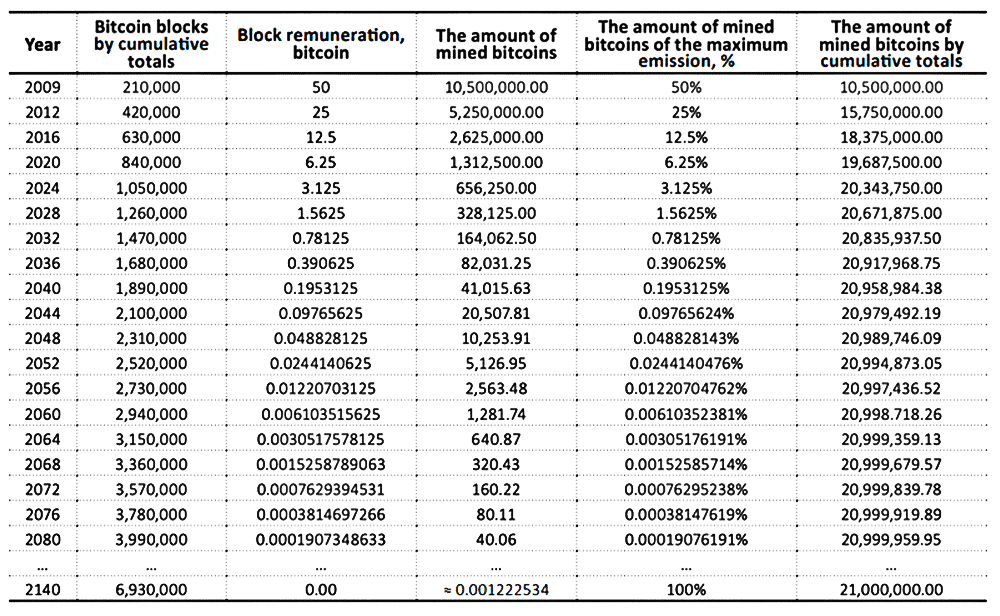 Du magst dich fragen, wenn bereits 18,881 Millionen Bitcoins gemined wurden und die maximale Anzahl von Bitcoins 21 Millionen beträgt, sollten wir nicht bereits fast alle Coins gemined haben? Das stimmt jedoch nicht. Durch die bereits erwähnte Halbierung wird dies noch einige Zeit dauern. Die Erwartung ist, dass alle Coins voraussichtlich im Jahr 2140 gemined sein werden. Das unten stehende Schema zeigt, wie diese Erwartung untermauert wird.