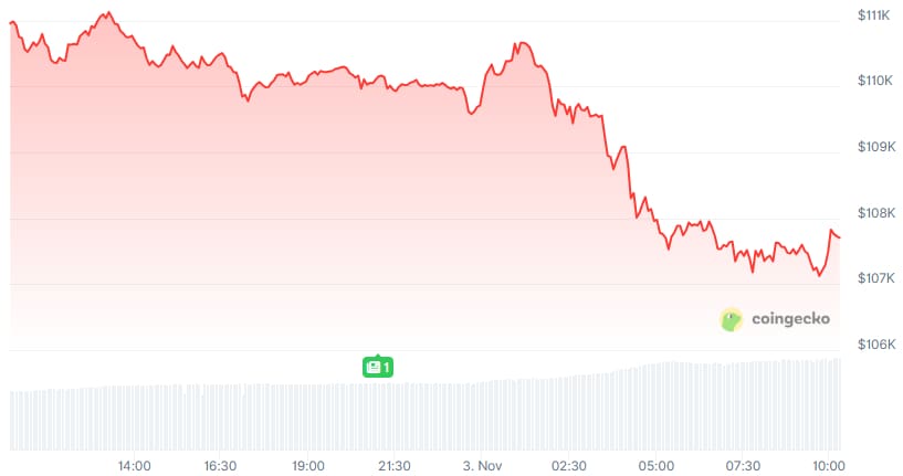 De koers verloor afgelopen nacht grip op de 110.000 dollar en zakt op het moment van schrijven naar de 107.000 dollar. Bitcoin staat vandaag 3,2 procent in de min.
