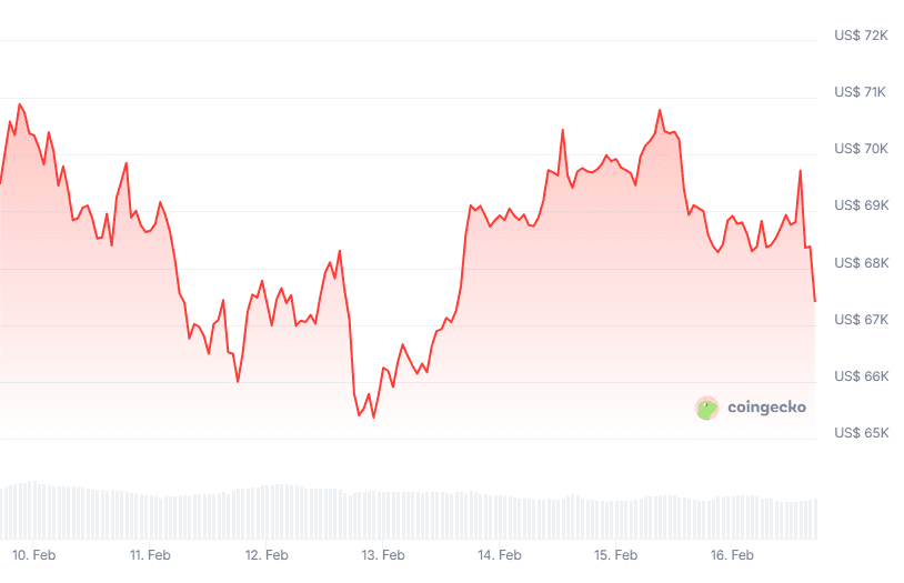 De cryptomarkt laat vandaag een lichte terugval zien. De totale waarde van alle crypto bij elkaar is met ongeveer 2,0 procent gedaald naar 2,4 biljoen dollar. Deze beweging wordt grotendeels geleid door bitcoin, die het afgelopen etmaal met 2,2 procent is gedaald. De prijs staat momenteel op ongeveer 67.374 dollar, wat neerkomt op 57.635 euro.