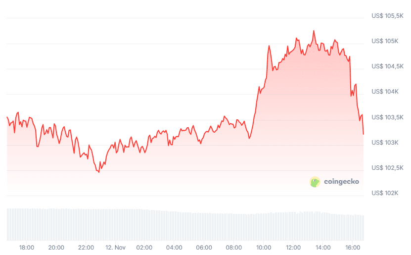 De koers van bitcoin steeg vandaag van 103.000 dollar naar 105.000 dollar en bleef rond dat niveau schommelen. Tot 15.30 uur, toen daalde de koers opnieuw naar 102.800 dollar. Hierdoor is bitcoin met 0,6 procent gedaald ten opzichte van 24 uur geleden.
