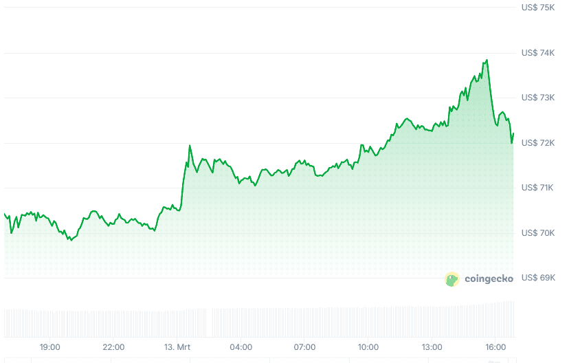 De motor achter deze beweging is bitcoin, die op het moment van schrijven een waarde heeft van 72.651 dollar, een stijging van 2,6 procent. In euro’s komt de prijs daarmee op 63.407, een plus van zelfs 3,3 procent in de laatste 24 uur.