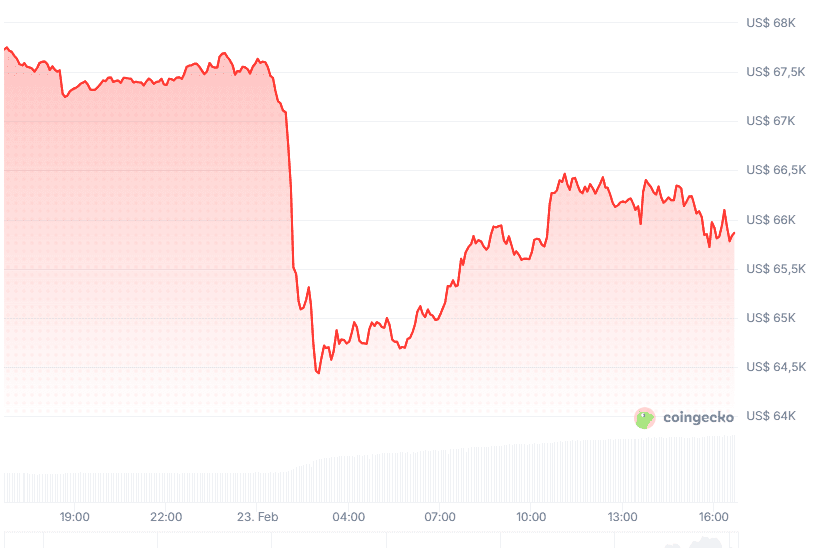 een onrustige start van de week. De totale waarde van alle cryptomunten is de afgelopen 24 uur met 2,0 procent gedaald tot ongeveer 2,34 biljoen dollar. Deze daling wordt aangevoerd door bitcoin (BTC), die op het moment van schrijven een verlies van 2,5 procent noteert en wordt verhandeld voor ongeveer 65.734 dollar. In euro’s is de prijs nu 55.859, een daling van 2,3 procent.