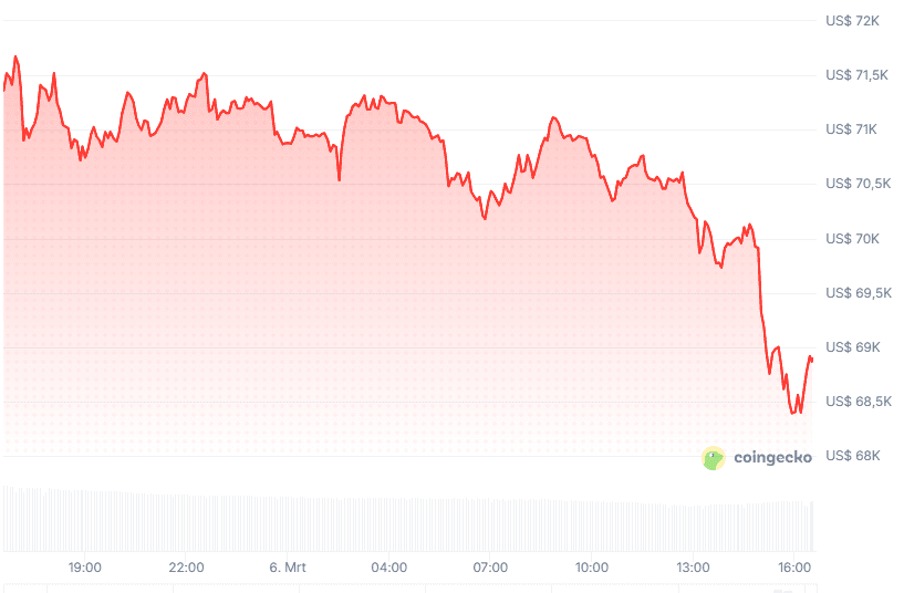 Het is een lastige dag voor de cryptomarkt. Bitcoin (BTC) is in de afgelopen 24 uur met ongeveer 3,9 procent gedaald en wordt momenteel verhandeld voor circa 68.765 dollar. In euro komt de prijs uit op ongeveer 59.182 euro, een daling van 4,4 procent.