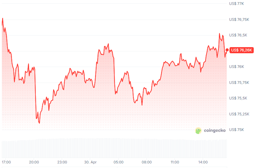 Bitcoin beweegt vandaag in een smalle bandbreedte en toont weinig vuurwerk. Op het moment van schrijven staat de prijs op ongeveer 76.343 dollar, een kleine daling van 0,4 procent in de laatste 24 uur. In euro’s komt dit neer op een prijs van 65.249 euro, een daling van 0,5 procent.