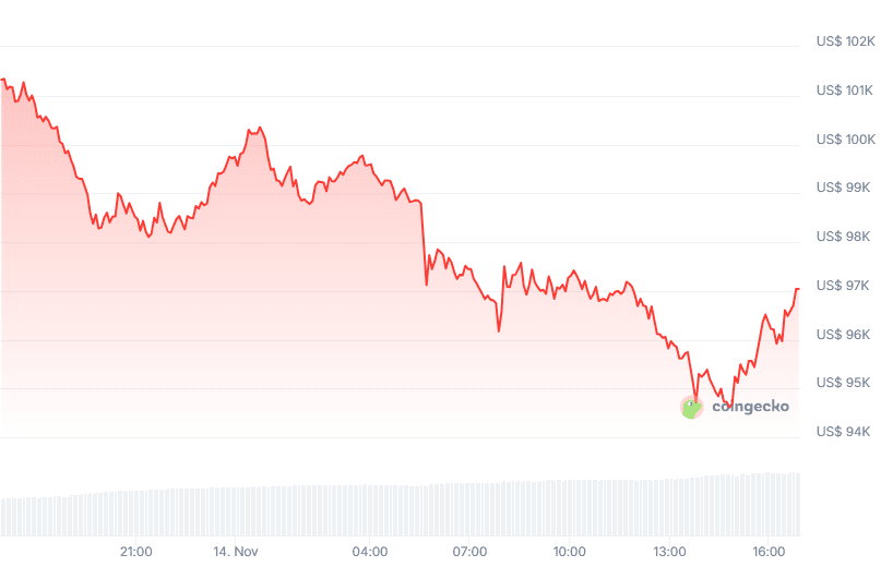 De koers is vandaag met 6 procent gedaald naar een prijs van 96.000 dollar. Vannacht om 00.30 uur Nederlandse tijd tikte de koers voor het laatst de belangrijke grens van 100.000 dollar aan. Sindsdien is de koers geleidelijk gezakt, eerst naar een dieptepunt van 94.000 dollar, maar inmiddels naar 96.000 dollar.