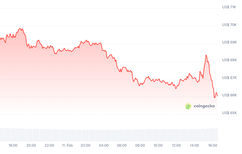 Bitcoin is de afgelopen 24 uur met ongeveer 4,3 procent gedaald en heeft op het moment van schrijven een waarde van circa 65.987 dollar. In euro’s komt dat neer op zo’n 55.611.