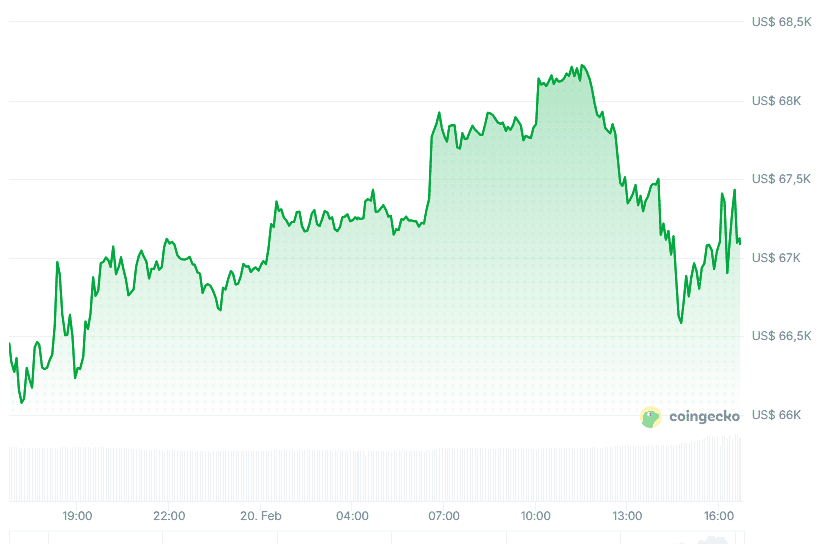 Op het moment van schrijven staat de bitcoin koers rond de 67.002 dollar. Dit is een stijging van ongeveer 2 procent in de afgelopen 24 uur. In euro uitgedrukt, komt de prijs neer op 56.707 euro, wat een lichte plus van 0,7 procent betekent.
