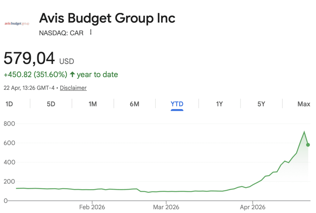 De aandelenkoers van autoverhuurder Avis is de afgelopen periode enorm gestegen. Een maand geleden stond de koers nog op zo’n 94 dollar, maar vandaag piekte deze ruim 800 procent hoger op 830 dollar. Sindsdien zakte de koers weer terug en op het moment van schrijven schommelt deze rond de 579 dollar.