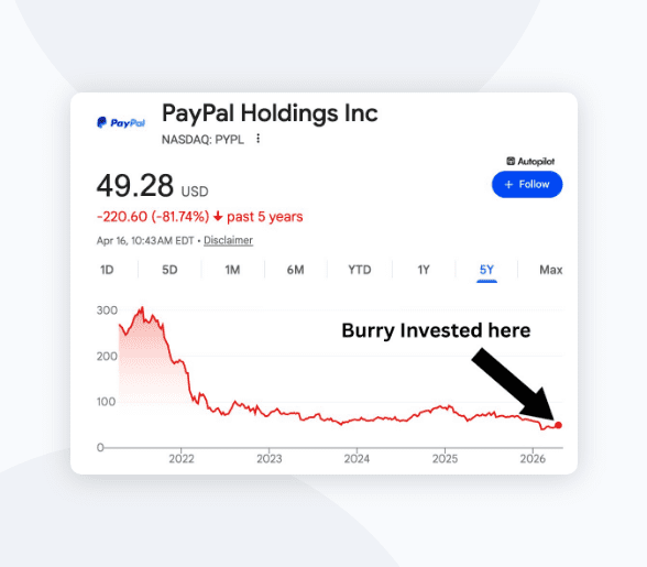Een van zijn opvallendste aankopen is PayPal. Het aandeel is de afgelopen jaren fors gedaald en noteert ver onder eerdere pieken. Volgens Burry kan dat juist een moment zijn waarop de waardering aantrekkelijk wordt.