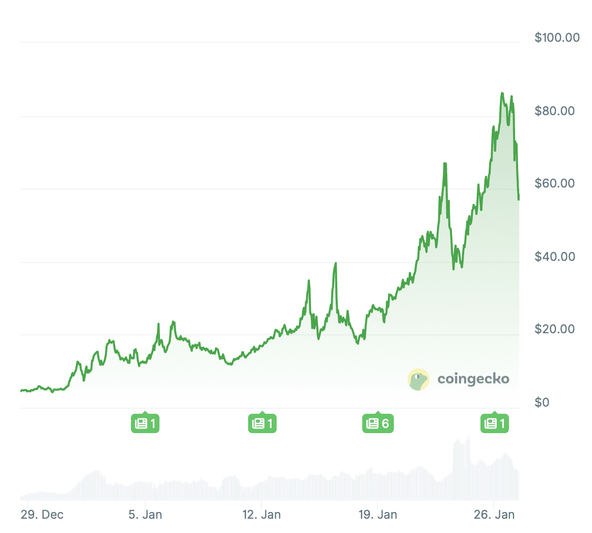 Op het moment van schrijven is river 61,38 dollar waard, wat ongeveer 1.250 procent meer is dan een maand geleden. Tot nu toe is river de best presterende altcoin van 2026.