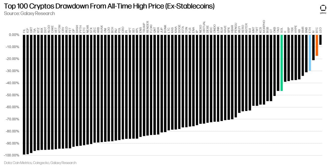 Dit jaar hebben meerdere grote cryptomunten nieuwe hoogtes bereikt, maar de meeste hebben het momentum niet vast kunnen houden. Sterker nog, het onderzoeksbureau Galaxy Research deelt op X dat maar liefst 72 van de 100 grootste cryptomunten 50 procent of meer vandaan zijn van hun recordprijs.