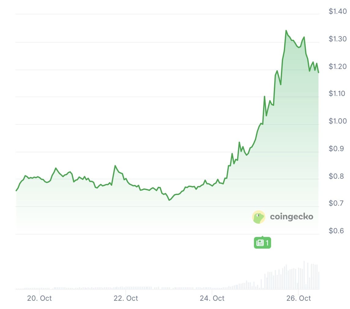 Virtuals steeg eerder deze week heel snel. In de afgelopen drie dagen is de koers met 80 procent toegenomen. Op het moment van schrijven is de munt 1,02 euro waard en AIXBT is 0,08 euro waard.
