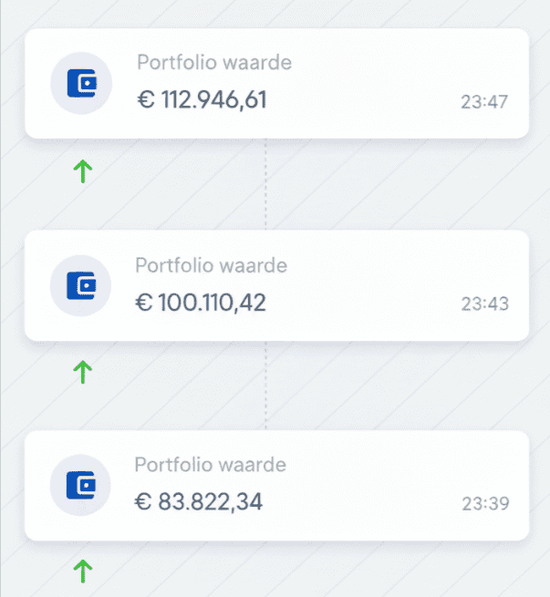 Binnen slechts vier minuten na die screenshot steeg zijn portefeuille razendsnel. De grens van 100.000 euro werd doorbroken, en het feest was nog niet voorbij: vier minuten later tikte hij zelfs de 112.946,61 euro aan.