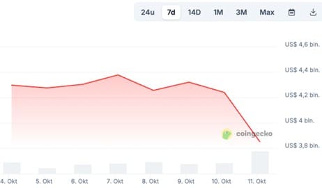 De cryptomarkt kreeg het de afgelopen 24 uur zwaar te verduren. Binnen 24 uur verdampte ruim 400 miljard dollar, bijna 345 miljard euro, aan marktwaarde. Daarmee daalde de totale waarde van alle cryptocurrencies van ongeveer 3,66 biljoen naar 3,25 biljoen euro. De crash behoort tot de scherpste correcties van dit jaar.