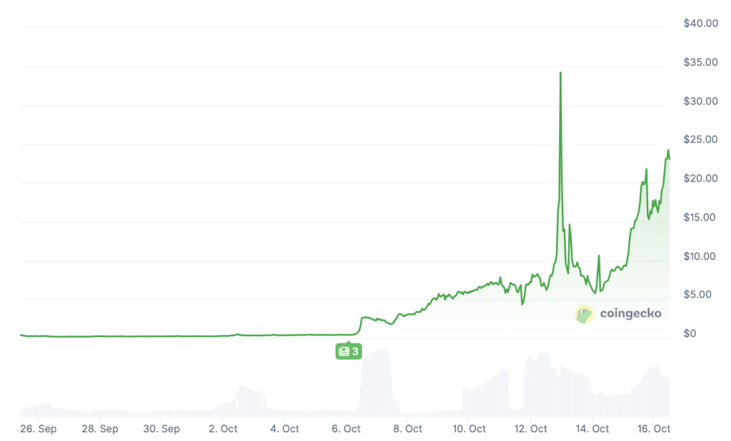 De afgelopen twee weken staat COAI behoorlijk in de schijnwerpers. Na lange tijd van gestage groei, explodeerde de koers van de token zondag plotseling opeens van 6,50 dollar naar ruim 34 dollar. Daarmee bereikte de koers een prijsniveau dat maar liefst 13.500 procent hoger lag dan bij de lancering.