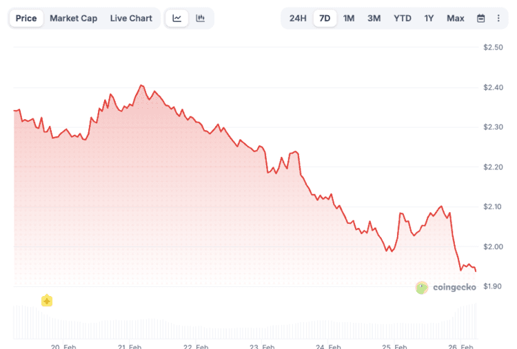 De koers van Cosmos Hub zakte in een week tijd van ongeveer 2,40 dollar naar rond 1,93 dollar. Dat betekent een daling van ongeveer 18 procent. Op hetzelfde moment stegen veel andere cryptomunten juist, mede doordat de markt positief reageerde op sterke kwartaalcijfers van Nvidia.
