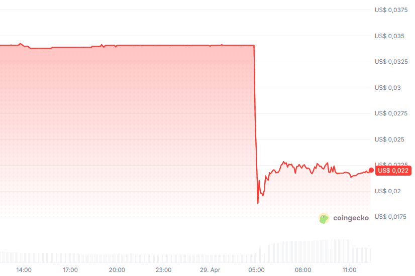 - De koers van de SYND-token daalde hierop met meer dan 37 procent, van 0,034 dollar naar een dieptepunt van 0,018 dollar.