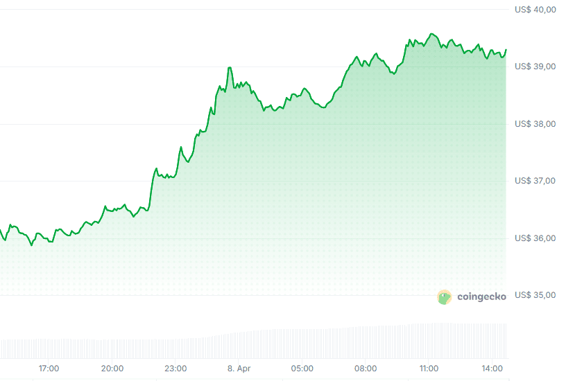 Vandaag stijgt de koers met ruim 8 procent naar de huidige koers van 39,23 dollar. Dit wakkert het enthousiasme van handelaren aan, die de munt nu vaker kopen.