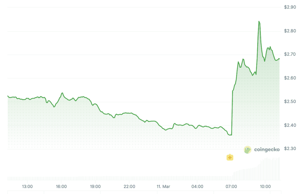 Direct nadat het nieuws bekend werd schoot de koers omhoog met 16 procent, van 2,36 dollar naar een piek op 2,84 dollar. Op dit moment bevindt de koers zich iets daaronder op 2,69 dollar.
