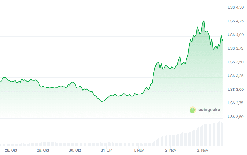 De handelsvolumes schoten vervolgens omhoog, wat een flinke toename in activiteit signaleert. Toch blijft voorzichtigheid geboden: ICP is inmiddels weer wat gezakt naar 3,93 dollar.