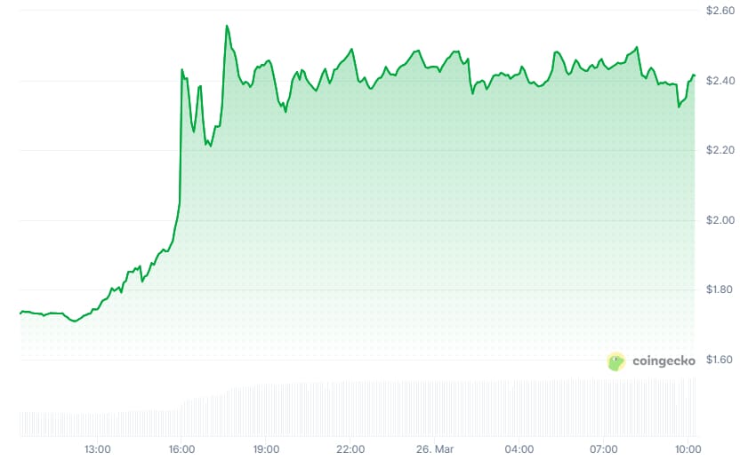 Op het moment van schrijven zakt de munt iets terug en komt deze uit op 2,40 dollar. De cryptomunt heeft nu een totale marktwaarde van 4,2 miljard dollar, waarmee het project in de top 25 grootste cryptovaluta terechtkomt.