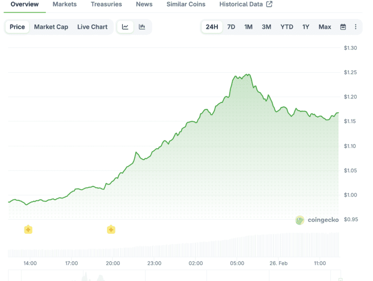 In de afgelopen 24 uur steeg de koers van ongeveer 0,98 dollar naar een piek rond 1,25 dollar. Inmiddels staat de prijs rond 1,17 dollar. De koers sprong omhoog nadat het project een nieuwe functie lanceerde met de naam “Confidential Intents”. Deze toevoeging moet transacties meer privacy geven.