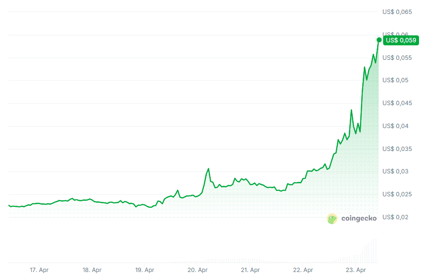 Over de afgelopen zeven dagen is de munt zelfs meer dan 140 procent in waarde gestegen. De grootste sprong gebeurde vanochtend in heel korte tijd: in slechts anderhalf uur, tussen 04:20 en 06:00, schoot de waarde omhoog van 0,037 dollar naar 0,054 dollar. Sindsdien is de koers gestabiliseerd.