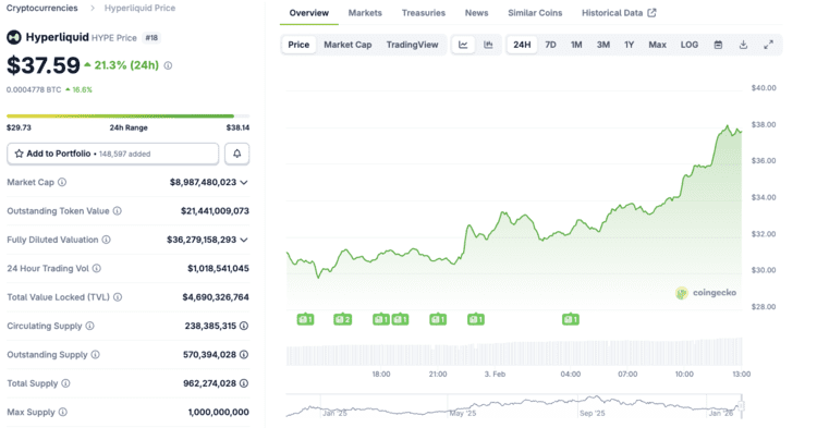Het nieuws werd positief ontvangen door beleggers. In de afgelopen 24 uur steeg de koers van Hyperliquid van ongeveer 31 dollar naar rond 38 dollar. Dat is een stijging van ongeveer 21 procent in één dag.