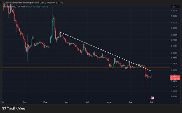 De maand oktober belooft echter geen garanties en zeker niet voor pi network. De munt verkeert namelijk in een negatieve positie, ook wel ‘bearish’ genoemd. De de kans op verdere daling blijft groot. De koers kwam een paar weken geleden weer onder een scherpe dalende trendlijn terecht en verloor daarmee een belangrijk ondersteuningsniveau.