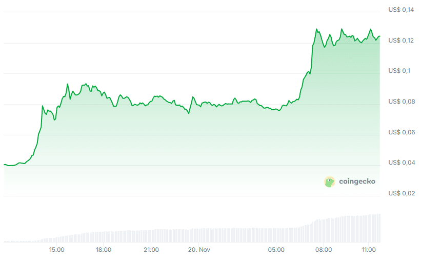 De koers van tensor is vandaag door het dak geschoten. Binnen 24 uur ging de munt van 0,039 dollar naar 0,124 dollar, wat neerkomt op een stijging van 200 procent.