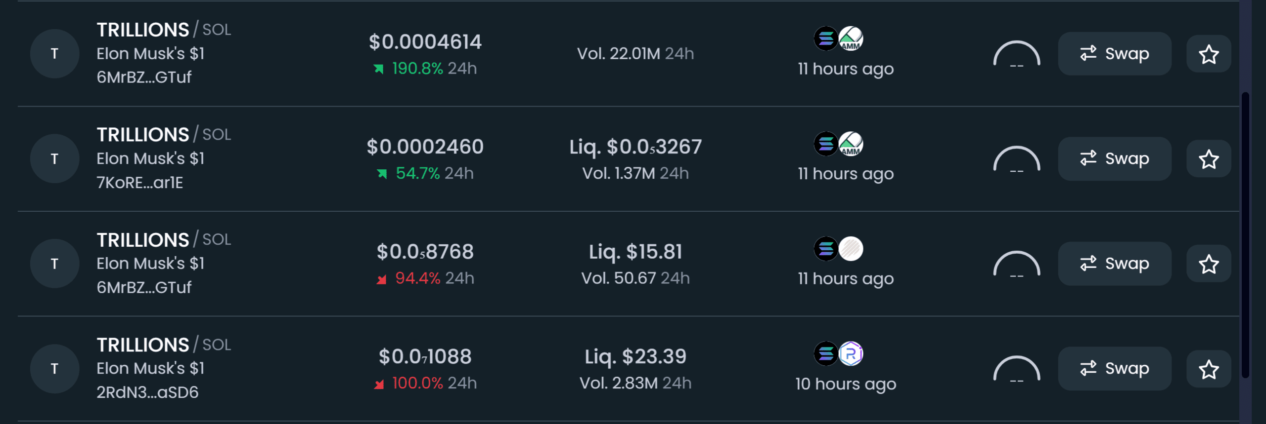 Nieuwe tokens met namen als “TRILLIONS”, “Elon’s $1” en “MUSK” doken massaal op op verschillende blockchains, waaronder Solana, Ethereum en BNB Chain.