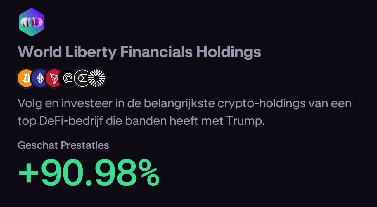 Daar wordt het zogeheten WLF-pakket (World Liberty Financials Holdings) aangeboden — een bundel geïnspireerd op de crypto-holdings van een DeFi-bedrijf dat nauwe banden onderhoudt met Trumps organisatie World Liberty Financial.