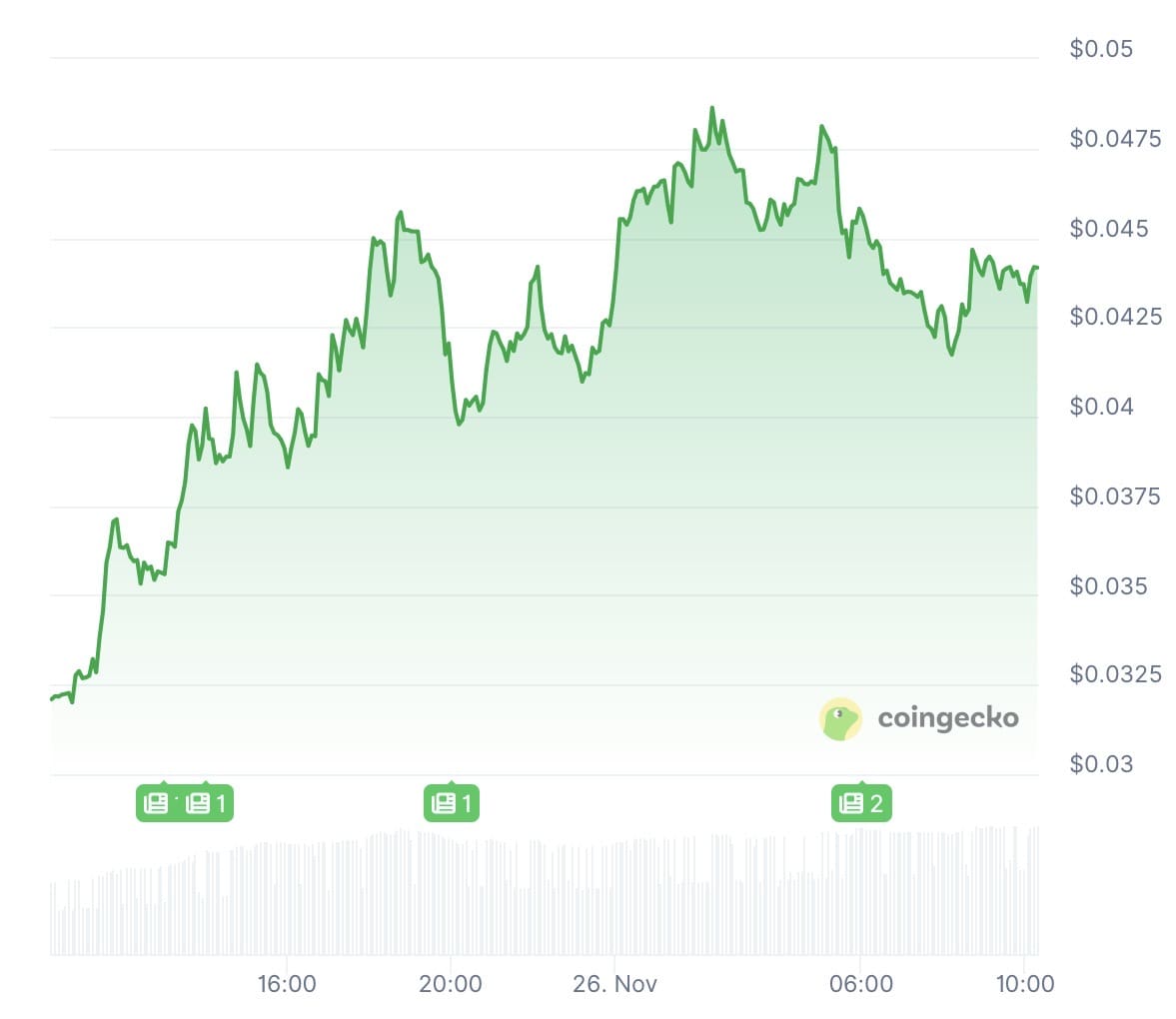 De cryptomunt monad is in de afgelopen 24 uur met ongeveer 38 procent gestegen, tot een prijs van 0,045 dollar op het moment van schrijven.