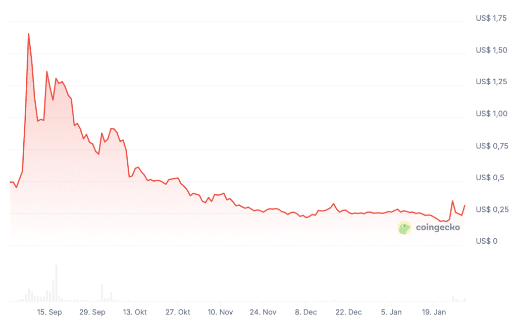 Somnia bevindt zich nu opnieuw op vergelijkbare hoogtes als afgelopen weekend, toen de koers ook explodeerde. Toen steeg de koers in één dag met 84 procent van 0,199 dollar naar 0,367 dollar. In de dagen erna zakte Somnia weer terug, tot de koers vandaag opnieuw steeg.