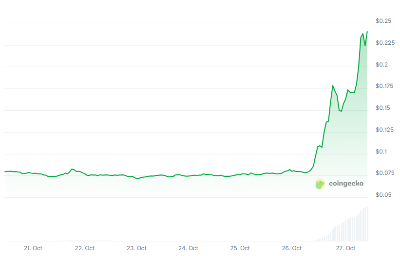 De koers van MAVIA is vandaag door het dag geschoten. Binnen 24 uur is de prijs met 160 procent gestegen en staat daarmee op 0,242 dollar. Gisterochtend begon de koers op 0,08 dollar aan een opmars tot 0,178 dollar, waarna de koers licht terug zakte naar 0,148 dollar. Maar de koers pakte het momentum snel weer op en knalde door naar het huidige prijspunt van 0,242 dollar.