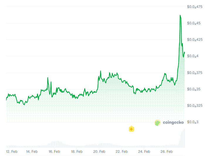 Twee weken geleden ging de cryptomunt nog van hand tot hand voor een prijs van 0,000032 dollar. Inmiddels steeg de koers in de afgelopen 24 uur tot een lokale top van 0,000048. De flinke waardestijging was al even aan de gang, maar raakte sinds gisteren in een flinke stroomversnelling.