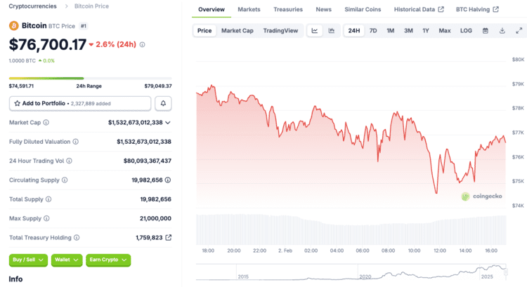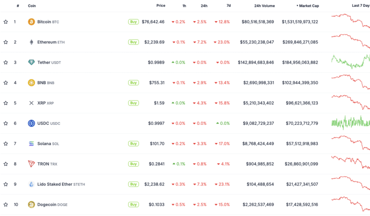 Op het moment van schrijven is er een licht herstel zichtbaar en staat de koers rond 76.500 dollar.