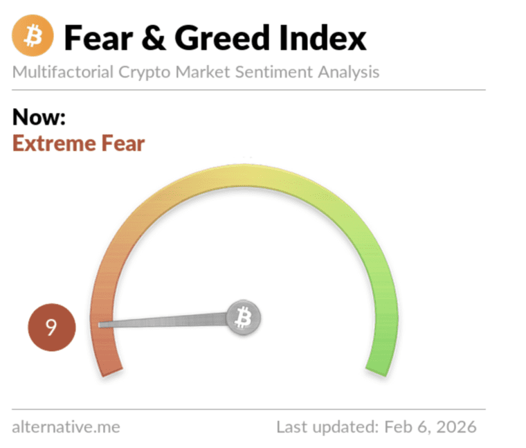 De Crypto Fear & Greed Index bereikte vrijdag een score van 9 op 100, terwijl Bitcoin verder daalde. Bron: Alternative.me