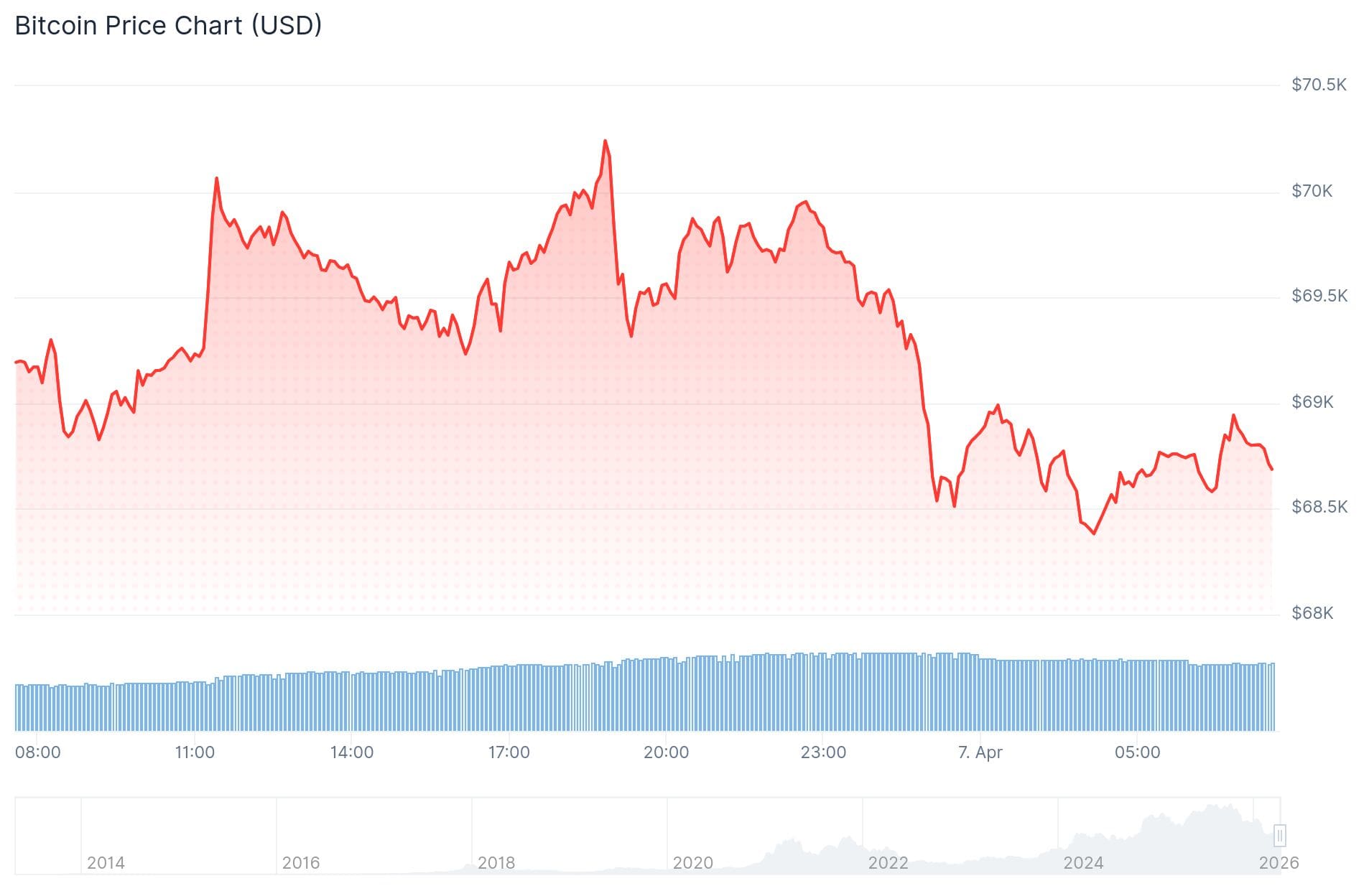 Gisteren heeft de koers verschillende keren aangeklopt op de deur van de 70.000 dollar. En aan het begin van de avond werd het hoogste punt bereikt sinds donderdag 26 maart van 70.300 dollar.