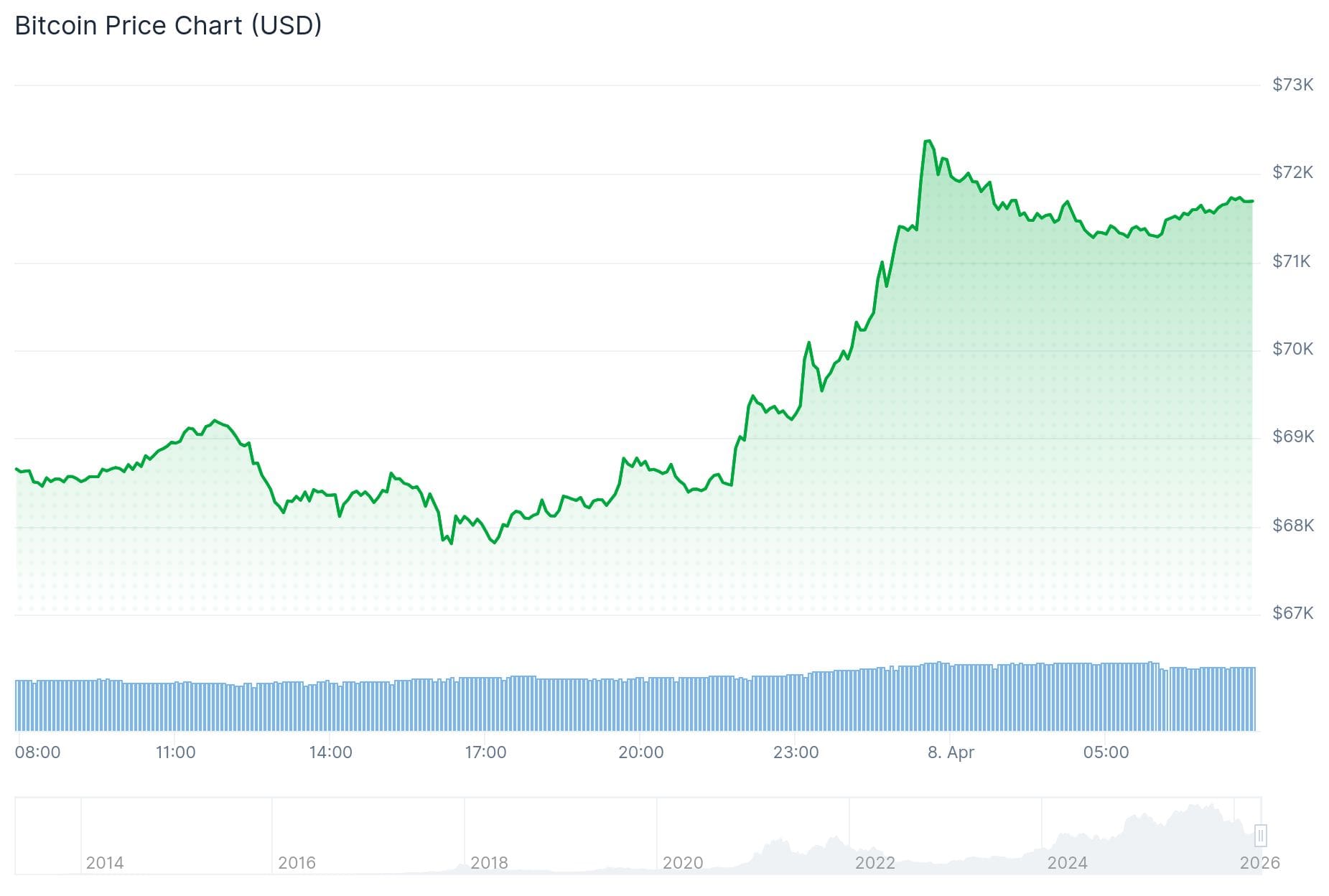 Daarna schoot het in één ruk verder naar een piek van 72.700 dollar, het hoogste niveau sinds 18 maart. Sinds het einde van de middag heeft de koers een klim gemaakt van meer dan 7 procent.