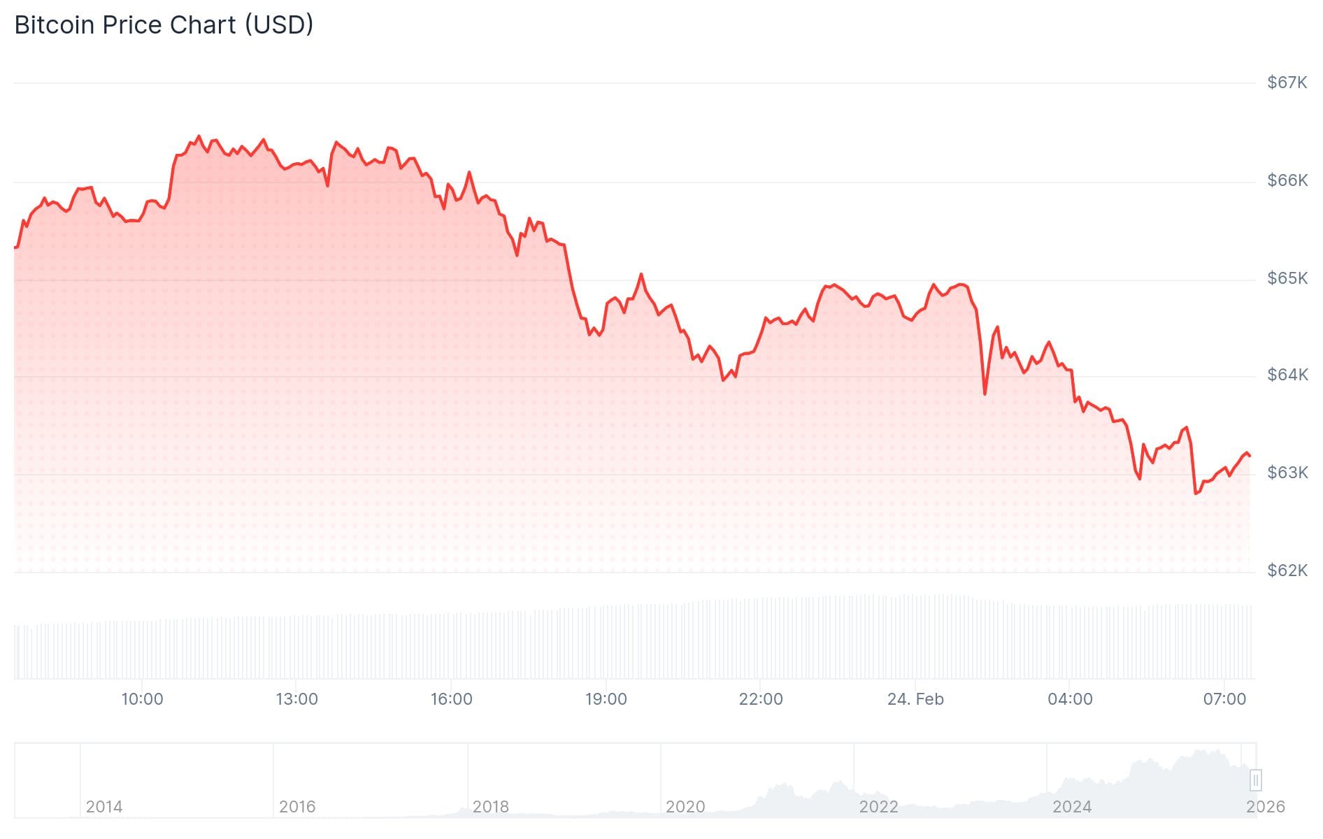 Gisteren werd er nog meer dan 67.000 dollar betaald voor bitcoin en vanmorgen werd een dieptepunt van 62.700 dollar bereikt.