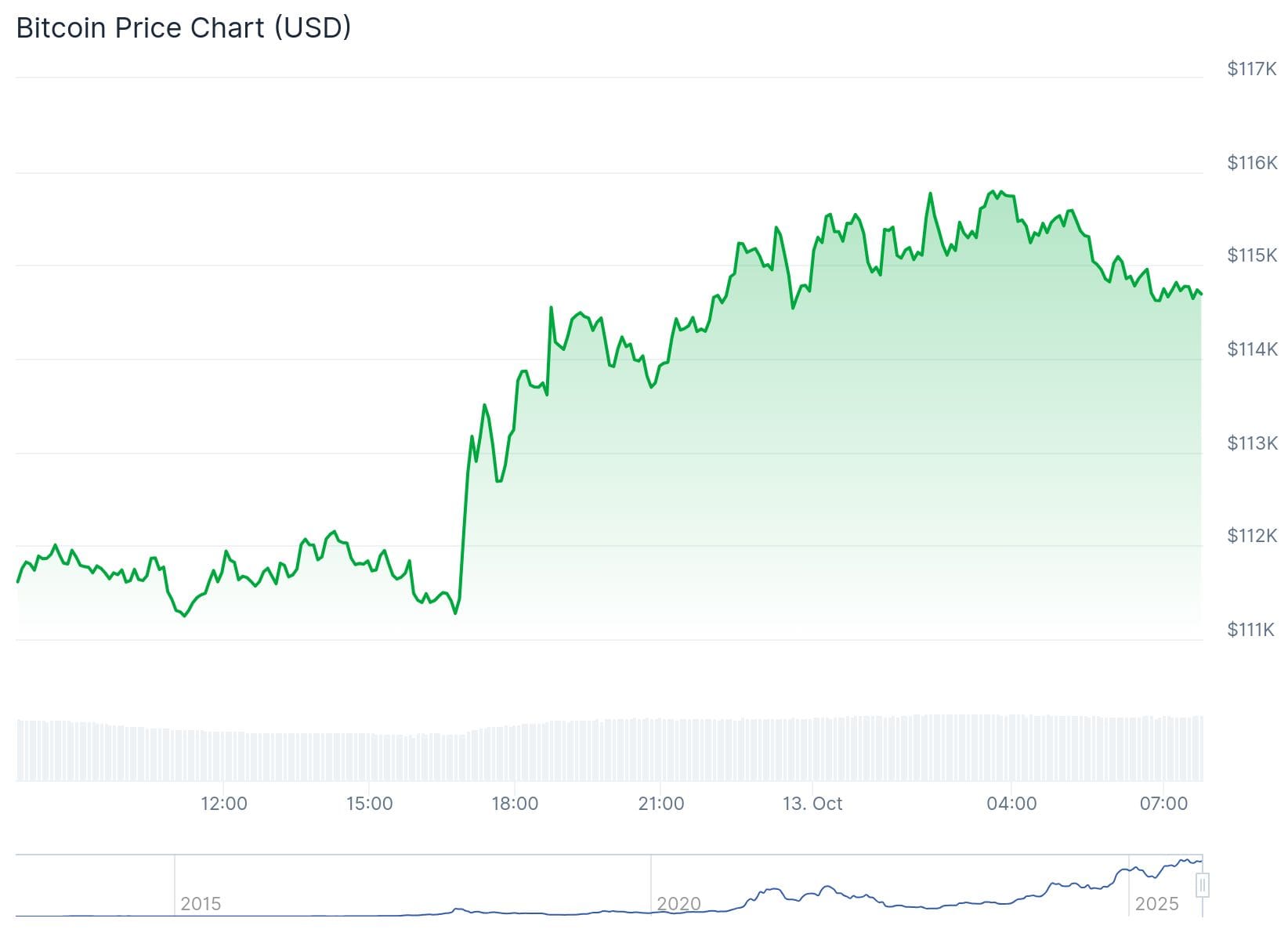 De bitcoin koers is nog op dezelfde hoogte als vrijdagmiddag, maar het heeft de afgelopen dag wel grote stappen gezet. Gisteren aan het einde van de middag stond de grootste crypto nog voor 111.000 dollar te koop, maar nu moet men bijna 115.000 dollar aftikken.