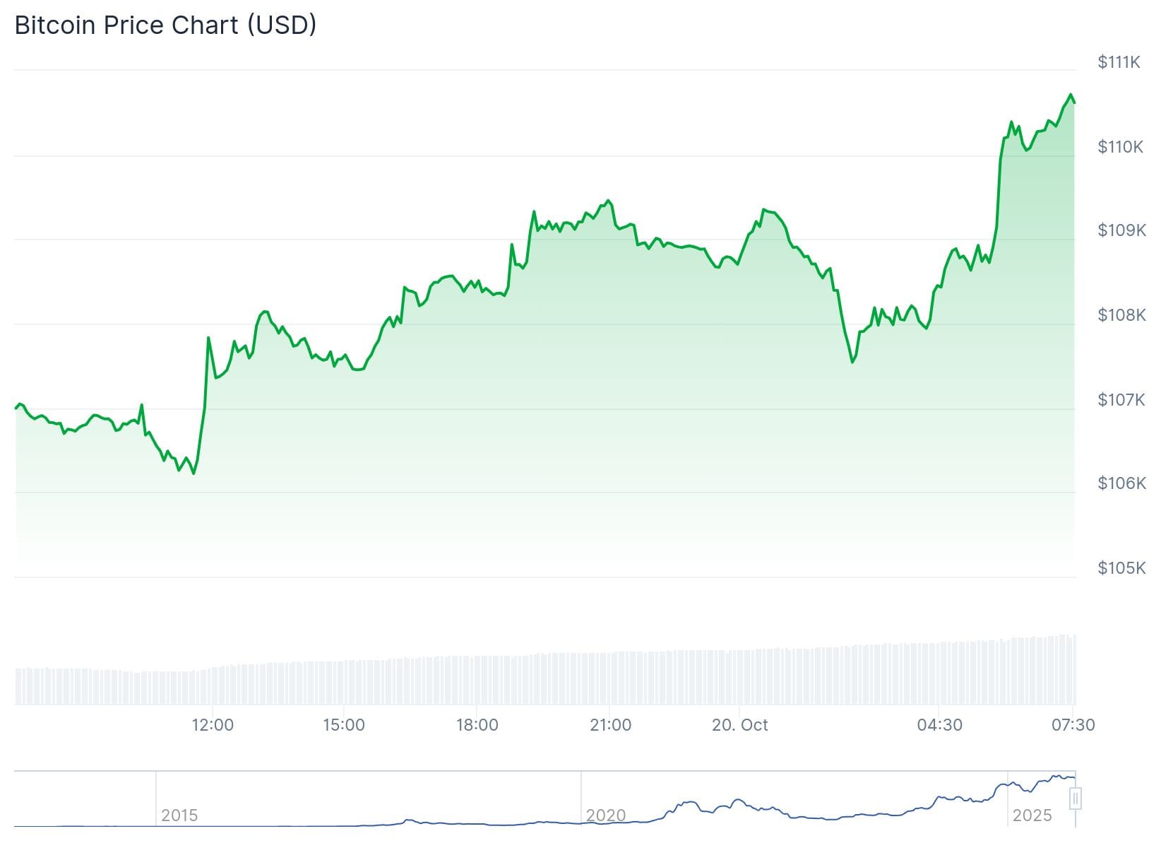 Voor de derde dag op rij kleurt de bitcoin koers nu weer felgroen. De grootste cryptomunt staat nu weer ruim boven de 110.000 dollar en heeft bijna twee dagen aan verliezen (donderdag en vrijdag) weggespoeld.