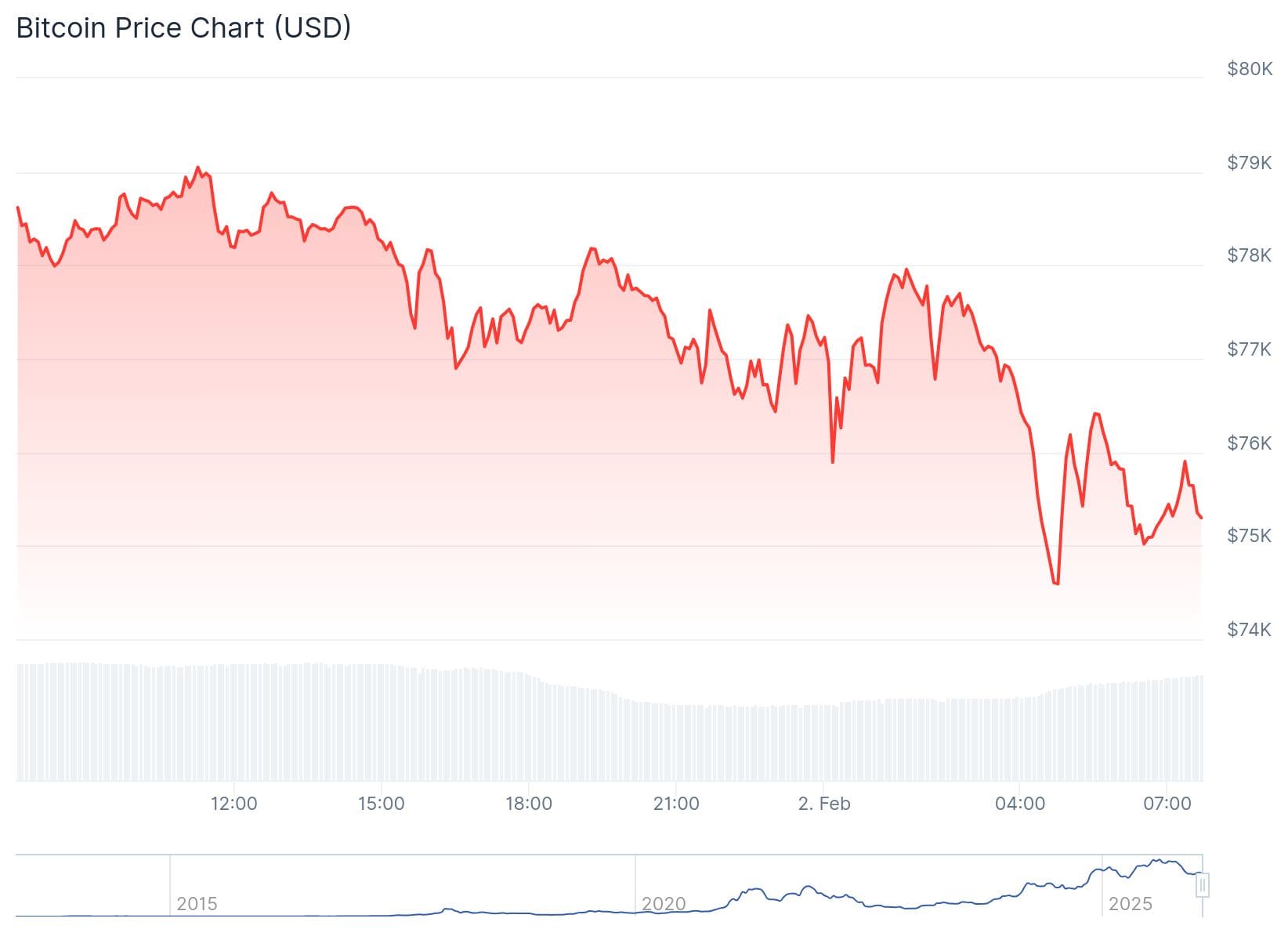 Diep in de nacht dook bitcoin naar zijn laagste koers sinds april vorig jaar van minder dan 75.000 dollar. Het scheelde minder dan 100 dollar of het dieptepunt te midden van de door Trump aangestichte handelsoorlog werd ook overtroffen.