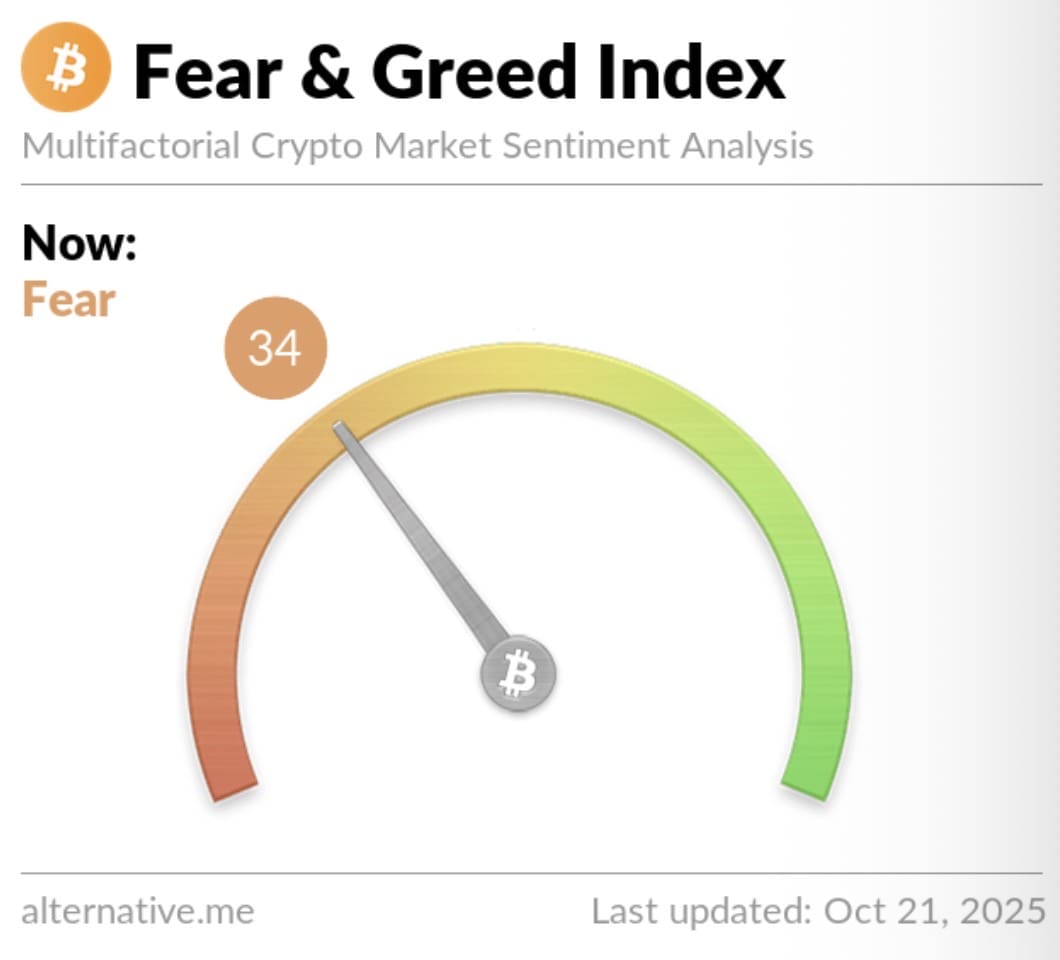 Op 9 oktober stond de index nog op 70, een teken van optimisme. Drie dagen later stond deze echter op 24, een teken van extreme angst. Op dit moment staat de index op 34, wat aangeeft dat angst het algemene sentiment op de crypto markt is vandaag.
