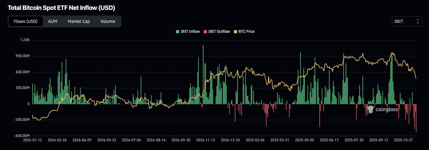 Uit on-chain-data blijkt dat vooral particuliere beleggers hun posities afbouwen. De grootste uitstroom ooit bij IBIT, de spot-bitcoin-ETF van BlackRock, wijst erop dat veel beleggers winst nemen of zelfs de markt verlaten.