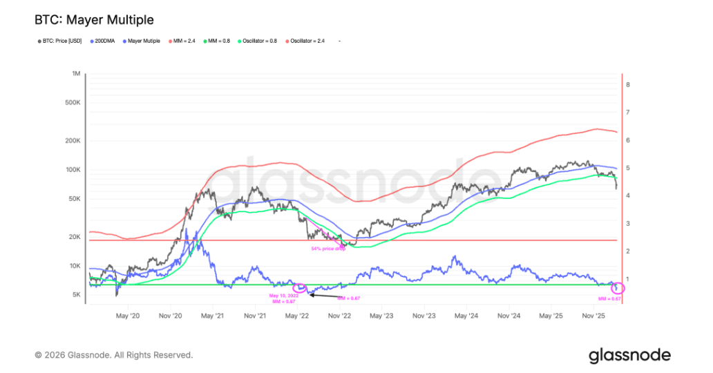Volgens data van Glassnode staat de Mayer Multiple nu rond de 0,65. Dat betekent dat Bitcoin ongeveer 35 tot 40 procent onder zijn 200-daags gemiddelde noteert. Ter vergelijking: de ‘groene band’, die vaak als oversold-zone wordt gezien, begint rond 0,8.
